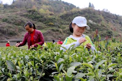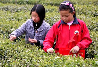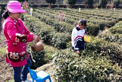 3月31日,竹山县竹坪乡陈家河无性系茶园里,一群中小学生,在家长的指导下,正在采摘芽茶鲜叶,体验劳动的快乐与艰辛,享受着劳动收获的喜悦。(视界网 张云朝 摄)