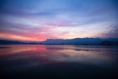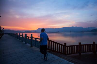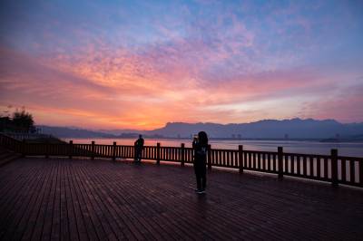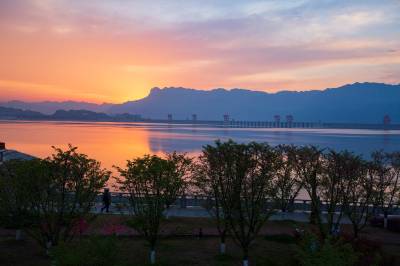2019年4月1日,在朝霞的映照下,三峡大坝上游水域一片绯红,平静的水面尤如一杯幽香醇厚、余味绵长的葡萄酒,晨练的市民在大坝对面屈原故里景区享受着绝美的平湖景色。