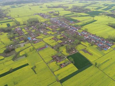 2019年4月2日,湖北省钟祥市丰乐镇蒙蒙春雨中的油菜花格外清馨,空中俯瞰油菜花海,乡村民居、乡间小道点缀其中,形成独具一格的田园风光画卷,成为清明时节最美的风景。(航拍钟国庆)