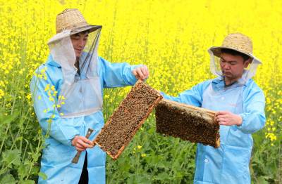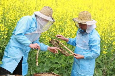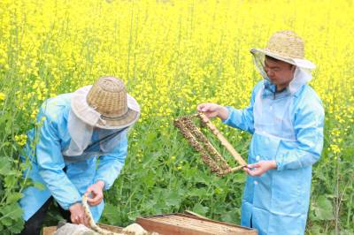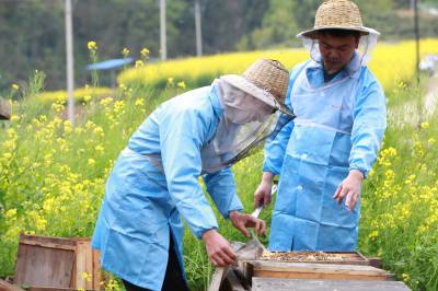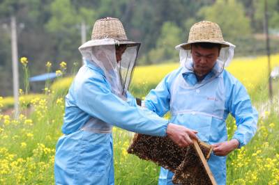 4月5日上午,湖北省竹山县溢水镇小东川村三组青年农民石成强(右),正在指导蜂农学习养蜂技术。8年前,石成强返乡养蜂创业, 成立了竹山县蜂之道蜜蜂养殖专业合作社,当起了合作社理事长,指导蜂农养蜂致富。目前,合作社养蜂1400余箱,年产蜂蜜约40吨,产值320万元左右。他的蜂蜜由于大山中空气无污染、花源品种多、品质好,深受消费者欢迎和喜爱。同时,他扩大电商销售渠道,蜂蜜销售到海南、福建等全国各地,蜂蜜供不应求,帮助数十户贫困户稳定脱贫。