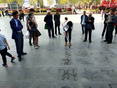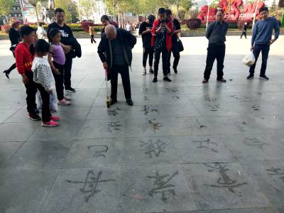 不远处,一位皓首老人,拿着文王笔,蘸着汉江水,在广场的地板上写下“欲穷千里目,更上一层楼”等诗句,书法笔力强健,雄浑有力。一位少女见状接过老人手中的笔,在地上写下“山有木兮木有枝,心悦君兮君不知。”字体清秀大方,老人边颔首称赞边进行辅导。不一会儿,地上满是他们“师徒”二人的书法墨宝。路人们都停下来,品读古代诗词,欣赏毛笔书法,感悟人生哲理,在不知不觉中受到启发和教育。
