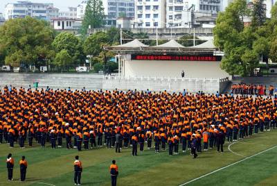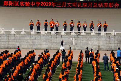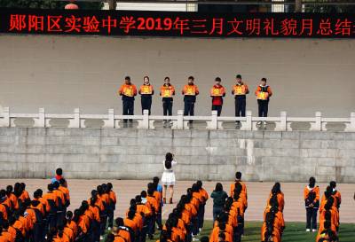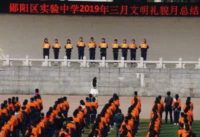 2019年4月8日,十堰市郧阳区试验中学师生在体育场隆重表彰三月文明礼貌月文明班级,文明班组和文明标兵。为深入持久的开展国家级"五城联创"活动,郧阳区在全区50多所大中小学开展文明月创建,并组织学生走上街头清扫街道和清除户外野广告的青年志愿者活动。