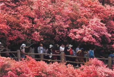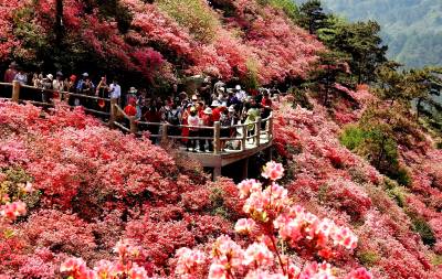 4月7日,武汉市黄陂区木兰云雾山杜鹃花,花开争艳,漫山红遍,美不胜收。十里杜鹃,十里画廊。每到3月底4月初的这个时候,全国各地的游客慕名而至,纷至沓来,花如红色之海,人如春潮涌动,形成了绿色的木兰,红色的云雾山,现场蔚为壮观,为此感叹不已。