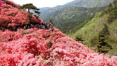 最佳观赏杜鹃花的“十里花山”,它是该市内保存完好的一条天然原始杜鹃林带,长约10里,而此山是以映山红为主,还有紫花杜鹃、锦秀杜鹃、云锦杜鹃、红棕杜鹃等40余个品种的杜鹃花,很多品种的杜鹃花,也只有云雾山才拥有的。