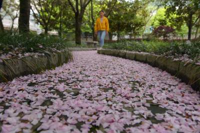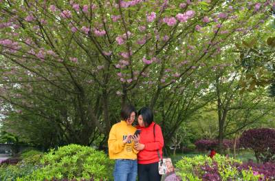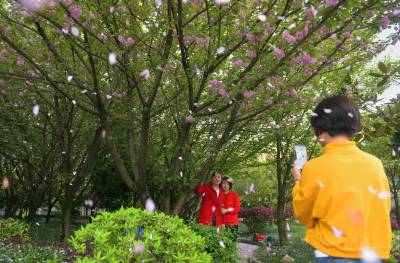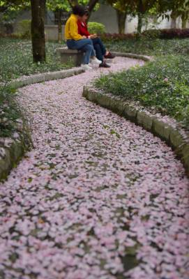 4月9日,人们在宣恩县兴隆大道融媒体花园欣赏“落樱”缤纷的美景。 一场春雨过后,宣恩县兴隆大道融媒体花园的樱花坠落满地,如梦如幻,吸引众多市民来此游玩拍照,欣赏这“落樱”缤纷的春季生态美景。