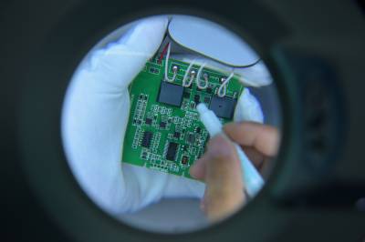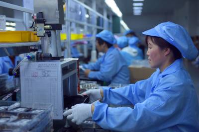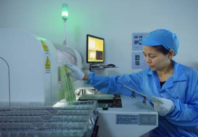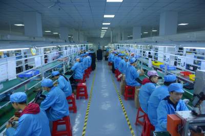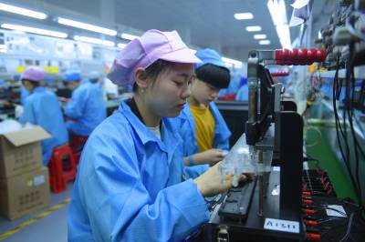 4月10日,宣恩县新坤电子的生产车间里,工人们正在新生产线上作业。