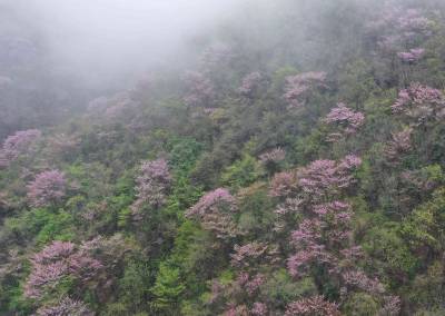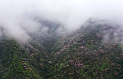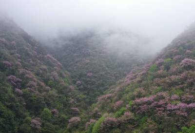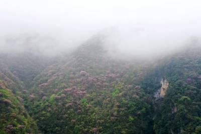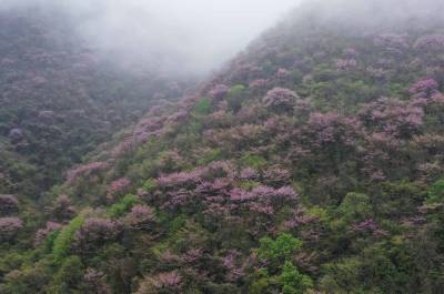 2019年4月10日,拍摄的保康县五道峡国家自然保护区的紫荆花海。 近日,地处保康县五道峡国家自然保护区的万亩紫荆花竞相开放,紫荆花海和云海相互映衬,宛若仙境,美不胜收。 (视界网 陈泉霖 葛歌 摄)