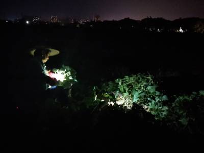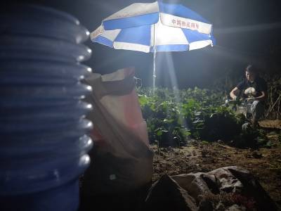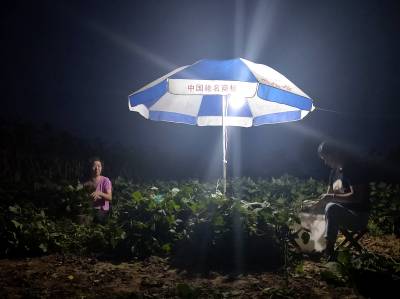 2019年7月20日,农民暑夜在云梦县城关镇白鹤村毛豆地采摘毛豆。 连日来暑热高温,云梦毛豆成熟。农民为避开太阳炙热高温,利用晚上时间带灯采摘毛豆。云梦县是湖北省蔬菜生产大县,毛豆成为一道主打产品,其优质毛豆销往武汉、郑州、北京、广州等地。