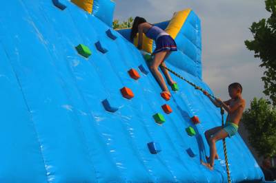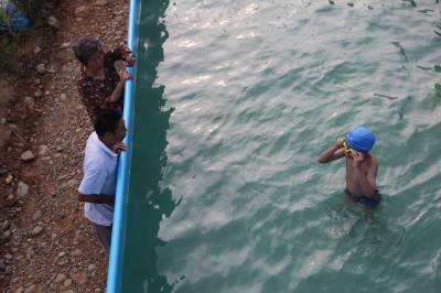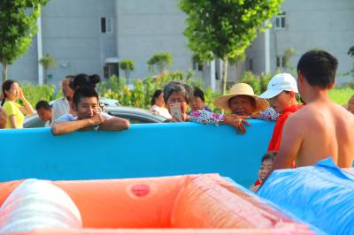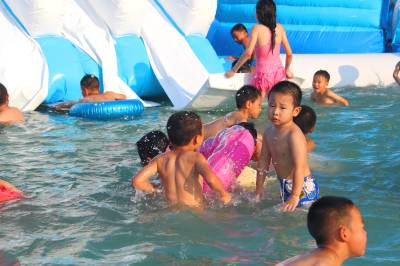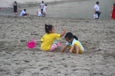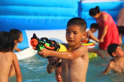 2019年7月20日,湖北十堰气温大幅走高,气象部门发出高温黄色预警,全市的最高气温也超过了38 ℃。在十堰市郧阳区柳陂镇龙韵村水上乐园、汉江北岸新打造的沙滩乐园等地吸引了众多消夏纳凉玩耍的孩童。(视界网 贺永摄)