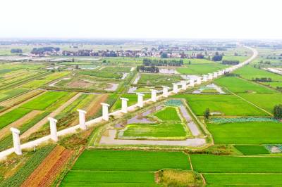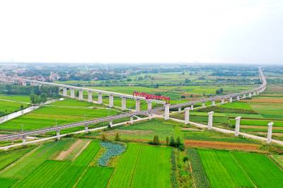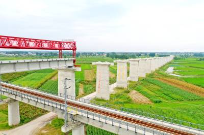 图为8月13日,在铁路工人的全力攻坚下,T梁已成功架设到武汉至仙桃城际铁路与江汉平原货运铁路交汇处,并顺利向前推进。(视界网 刘贤双 摄)