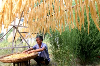 2019年8月17日,湖北十堰市房县白鹤镇赤岩村农民李正元正在晾晒手工豆油精。据史料记载,房县手工制作豆油精具有两千多年历史,曾经是唐朝庐陵王被贬房州(现今房县)时非常喜爱的一道美味佳肴。“房县豆油精”荣获国家地理标志产品, 是全省地标农产品的一张“金名片”,产品销售覆盖全国25个省、直辖市,俏销日本、越南、韩国等多个国家,年均实现收入达15亿元,带动全县10万贫困农民增收致富。据悉,该县豆油精所选黄豆来自当地无环境污染地产品,磨制豆浆的水属地下天然矿泉水,手工制作的豆油精纯生态、豆香味浓厚、口感独特,可配菜炒制,也可做汤,被人们誉为天然“植物肉”。