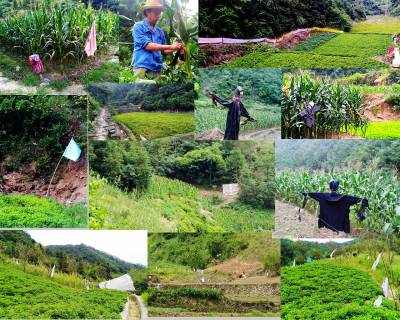 秋收到来,秋粮丰收在望,但山上的野猪、獾子等野生动物也纷纷下山,和种粮的农民争夺粮食。农民为了保住自己的劳动成果,采取了在地里挂音箱、搭窝棚、敲锣鼓、竖假人、插旗帜、拉布条、扯标语等等一切办法,尽可能降低因野兽侵袭造成的损失。目前,农村秋玉米已收获大半,农民用各种“阵法”保护的是花生、蔬菜等农作物。图为农民在地里布置的各种护秋工具。(视界网 周宗华 摄) 作者地址:十堰市郧阳区五峰乡政府;电话:15727082525.