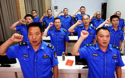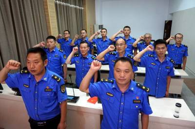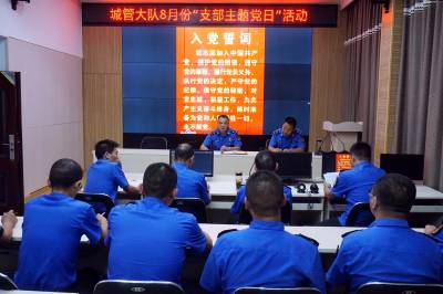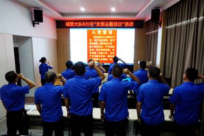 2019年8月21日下午,十堰市郧阳区城市管理执法局城管大队党支部开展主题党日活动,党员们全体起立奏国歌,交党费学文件,学习模范英雄人物和英雄集体,谈体会讲心德,最后全体起立举起右手重温入党誓词。郧阳区1040个党支部每个月按时开展主题党日活动,经常性开展"三会一课"教育活动,保持党员的先进性。