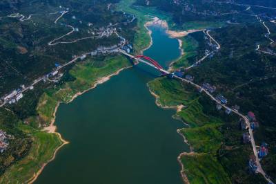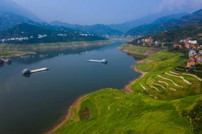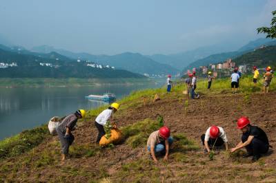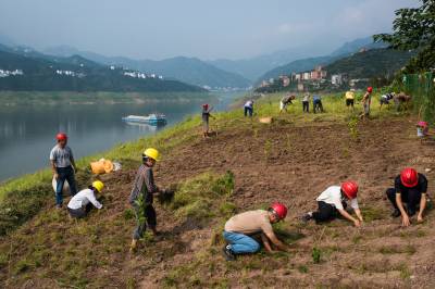 三峡库区消落带复绿 8月22日,在三峡库区湖北省宜昌市秭归县童庄河流域,当地居民正在利用三峡水库现在水位低的时机,在库岸消落带上栽种疏花水柏枝、狗牙根、香根草、暗绿蒿等水陆两栖植物,以利三峡库区消落带迅速复绿。