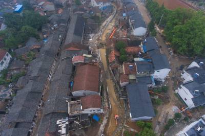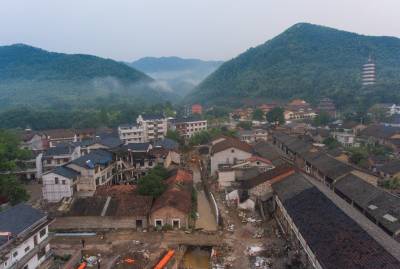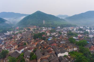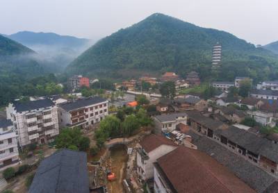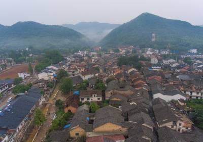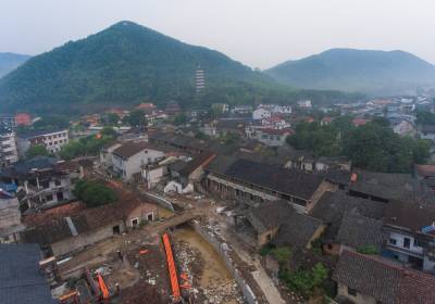8月23日,无人机拍摄的赤壁市羊楼洞明清古街修复工程现场。