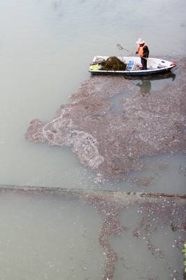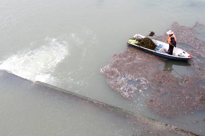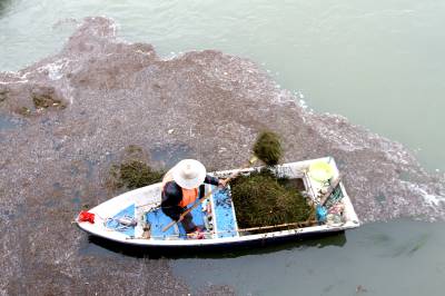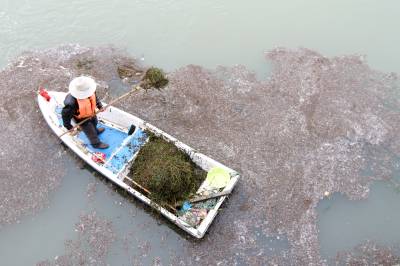 2019年10月26日,洪水退落后,一名不占财政编制的编外河流保洁员在房县马栏河城关镇东关社区段打涝被洪水冲击到回水处的漂浮草渣。房县选任265名农民“河长”、120名农民保洁员,担任管理乡村河流。这些体制外的农民“河长”、保洁员,负责保洁流经本村庄的河流,确保水清河畅。目前,该县农民“河长”管理的265条乡村“母亲河”,河流水质达到国家Ⅰ或Ⅱ类标准,生态河流成了野鸭、白鹭繁衍生息的乐园。