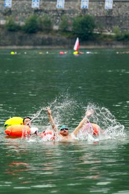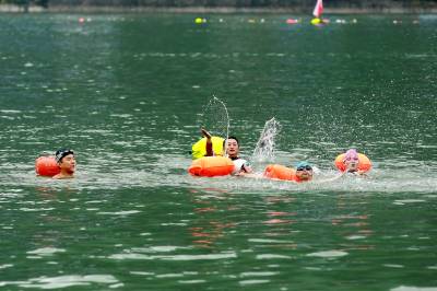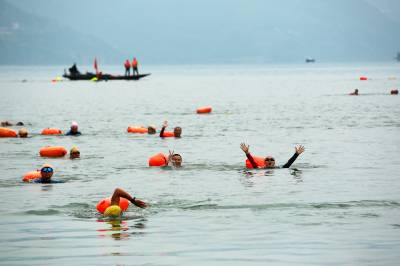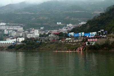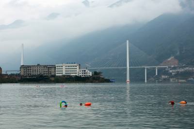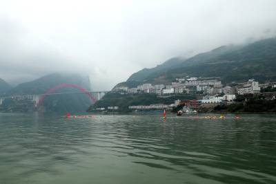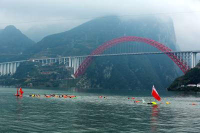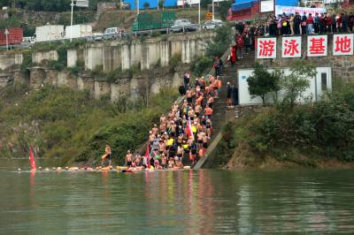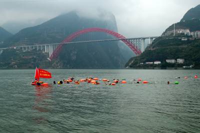 当日,来自湖北汉口、长阳、兴山、夷陵及秭归等地100多名游泳健将,横渡长江三峡西陵峡兵书宝剑峡峡口,以庆贺武汉军运会的成功举行。