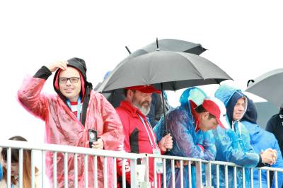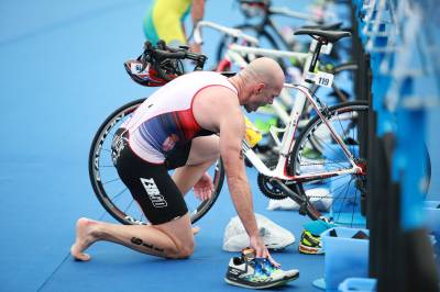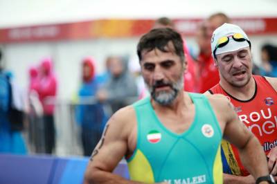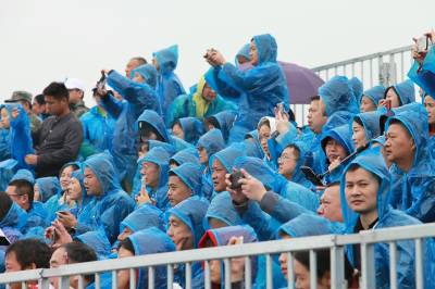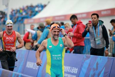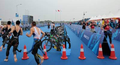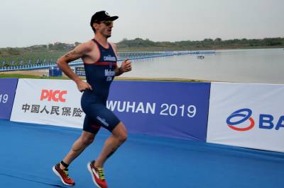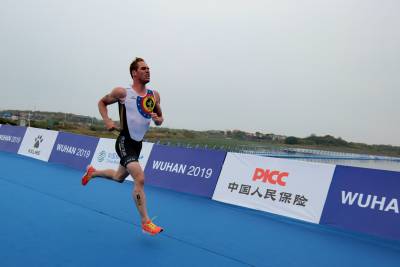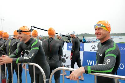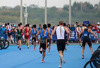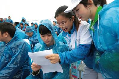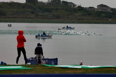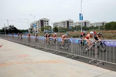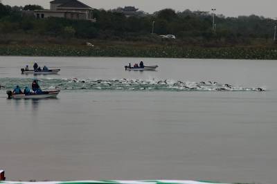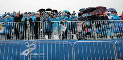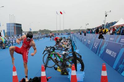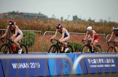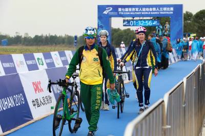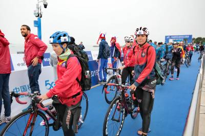 27日,世界军人运动会的海军铁人三项在武汉江夏梁子湖如期举行。开赛前下起蒙蒙细雨,但丝毫没有影响比赛进程,运动健儿在风雨中一展军人风采。