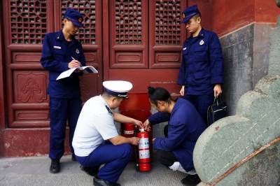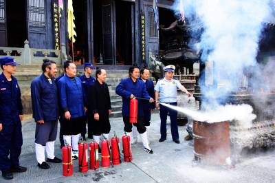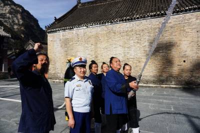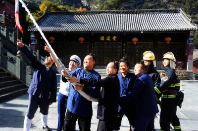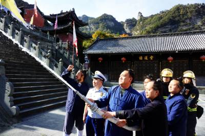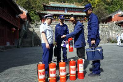 2019年10月27日,武当山中观的道士们正在演练多人水枪灭火和灭火器灭火。为守护世界历史文化遗产武当山古建筑群,武当山消防救援大队和道教协会密切配合采取定期和不定期的方式检查演练消防灭火工作。