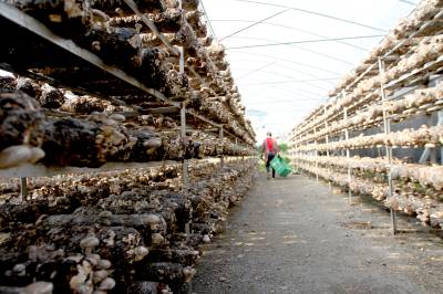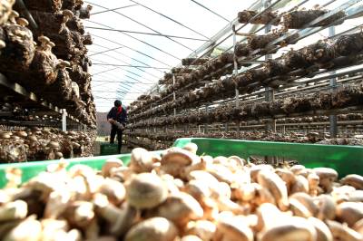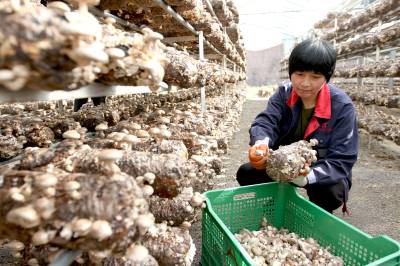 2019年10月29日,房县军店镇月明村农民在香菇扶贫产业园采收香菇。房县实施“公司 +专业合作社 +入股 + 务工”的模式,再通过帮技术、回收耳菇、小额信贷等载体,促进农民发展香菇、黑木耳产业增收。目前,全县年均生耳菇2万多吨,耳菇产品销往日本、德国、泰国等30多个国家和地区,年实现产值6亿元,耳菇产业带动全县6万多农民致富。