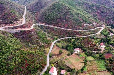 这是10月28日无人机拍摄的南漳秋景。蜿蜒的251省道穿过湖北省南漳县肖堰镇马鞍山间。秋日的美景与美丽的公路形成一道亮丽的风景线。