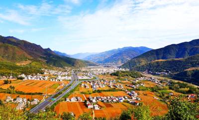 2019年10月27日,拍摄的保康县寺坪镇简家坪村田园秋景。 深秋时节,保康县寺坪镇简家坪村,谷竹高速穿越金色田野、村庄,山水田园的美景令人陶醉。
