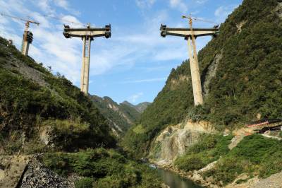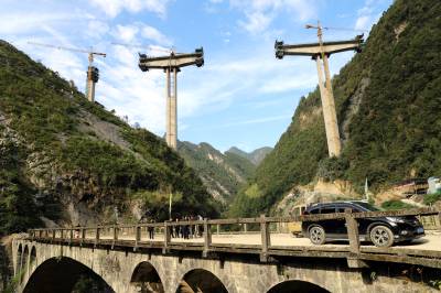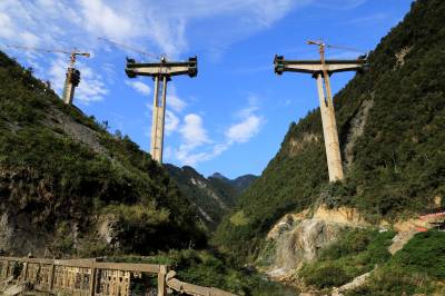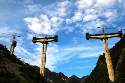 图为建设中的鹤峰县两河口大桥,是鹤峰县南潼公路(复建段)工程中的其中一段,是鹤峰县首座百米高墩预应力混凝土连续刚构桥。两河口大桥横跨鹤峰的母亲河溇水河。江坪河水电站蓄水后,两河口大桥下水库正常蓄水水位470米,桥下的公路、树木将永远沉于水中。