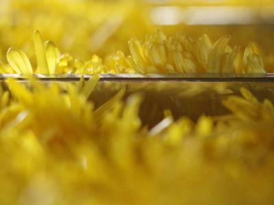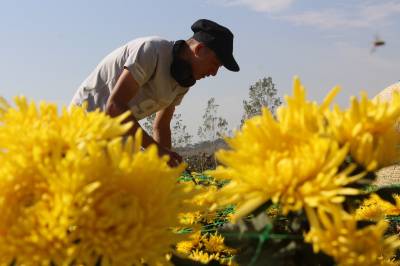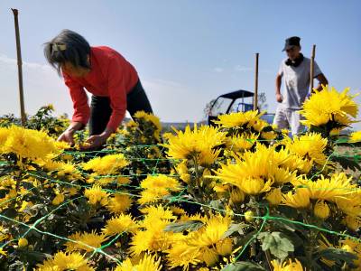 2019年11月1日,云梦县清明河乡三港村村民在村民刘云香的菊花地里采摘盛开的菊花。