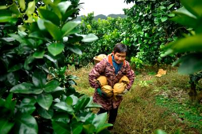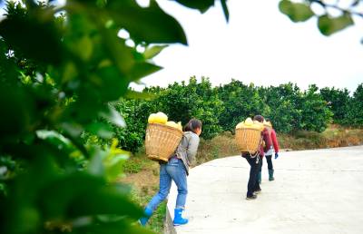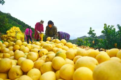 11月20日,在宣恩县李家河镇白柚基地,村民正在柚园里采摘、取袋、打包,将挑选好的贡水白柚销往重庆、黔江等地。