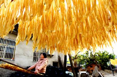 2019年11月23日,房县白鹤镇赤岩村农家妇女袁道玉在晾晒手工豆油精,袁道玉说,她平均每年加工豆油精实现收入20万元。史料记载,房县手工制作豆油精具有2000多年历史。“房县豆油精”现被确认为国家地理标志产品,俏销日本、越南、韩国等6个国家,涵盖国内25个省、直辖市,年均收入15亿元,带动全县10万名贫困农民增收致富。据悉,豆油精由黄豆磨成豆浆,并将蒸好的豆浆表面上一层豆油由手工揭起来,通过晾晒、包装,就可以上市销售。