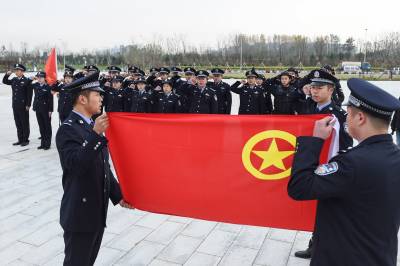 图4:该处襄阳东车站派出所副所长、青年突击队队长杨进代表全体青年民警做表态发言。;