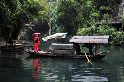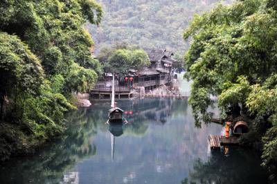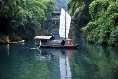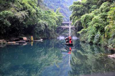 在龙进溪水与长江的交汇处,小渔船撒开了渔网,初峡亭精巧别致。在近溪的一边,一道水坝截住了清幽的龙溪水,溪水碧绿,林木苍翠,斑驳沧桑的龙溪桥横跨其上,几只小渔船静静地泊在桥下。