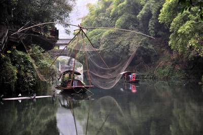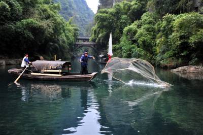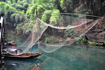 2019年11月26日,寒冬时节,在长江西陵峡畔的宜昌市夷陵区三峡人家风景区,龙进溪里恬静秀美、竹影婆娑、烟雨弥漫,原生态温情涟漪荡漾,峡江渔家风情扑面而来,捕鱼者或岸边撒网,或伴鹰荡舟河面,一河风景半河风情。