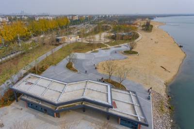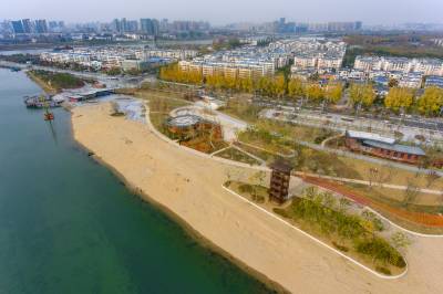 12月5日,一片金黄色的沙滩亮相襄阳市鱼梁洲汉江边,明年3月建成后将免费对外开放,供市民和游客在汉江江边享受日光浴。