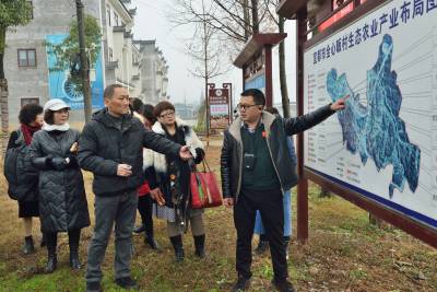 12月26日,宜都市枝城镇全心畈村党总支书记曹光兆(图中戴扩音器者身戴扩音器为来自武汉的游人介绍村“美丽宜居”村庄建设。当天,来自武汉的50多名游人乘大巴来村旅游观光,在此之前,游人们游览了宜都鲟鱼养殖基地、宜都洞藏酒业赤云洞基地。