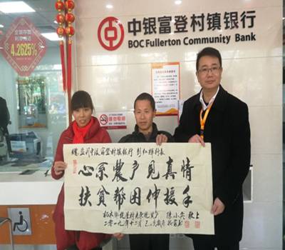 2019年12月27日,监利县柘木乡陡星村脱贫户陈小兵在该乡包村干部邓幼清同志的陪同下,来到监利中银富登村镇银行,陈小兵和爱人手里紧紧握着一面“中银富登,福惠乾坤,精准扶贫,情暖人心”的锦旗,和特地在当地请书法人士写的一幅字"心系农户见真情,扶贫帮困伸援手"。对于陈小兵来说,昔日远近闻名的贫困户,成为如今村里致富路上的“领头兵”,今非昔比的巨大变化离不开他的扶贫包保人,监利中银富登村镇银行行长彭红辉同志。