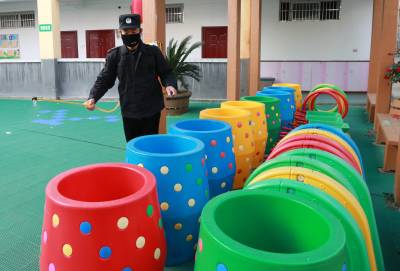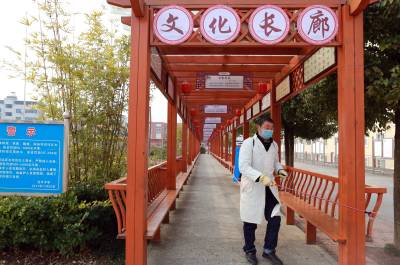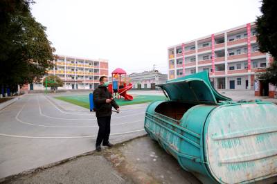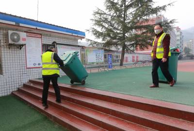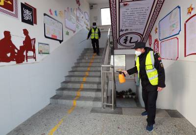 2月2日,竹山县宝丰镇中学、施洋小学、红卫小学、镇中心幼儿园等学校正在开展校园消毒、环境清扫等活动。