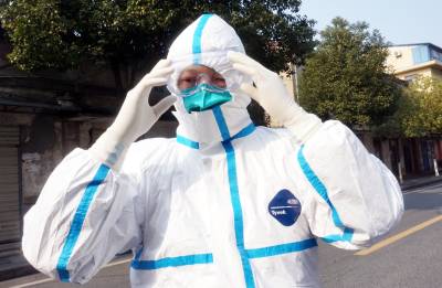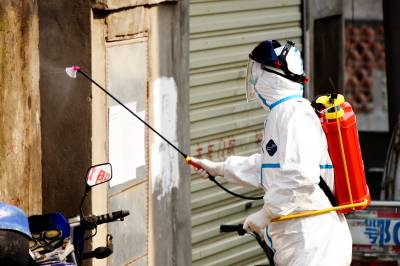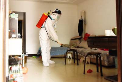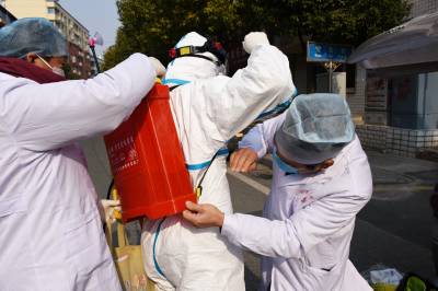 我追踪的一组在城区内,出发前防疫人员准备各种消毒装备,然后装车,电话联系后来到东岭街与凝似患者家属见面,了解家庭成员详细接触情况,准备消毒液,防疫人员开始穿防护服,在脚上穿双层脚套,戴上口罩、双层橡胶手套、戴上护目镜,护目镜外在戴上防护面罩,背上喷雾机先从门口、阳台喷洒,然后进屋内对厨房、卫生间、卧室、客厅逐一喷洒,完成喷洒消毒后再对拉圾箱进行喷洒消毒。