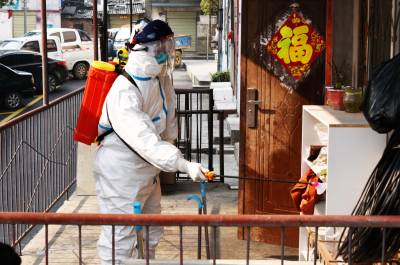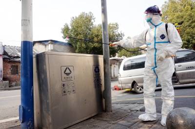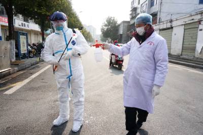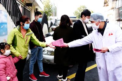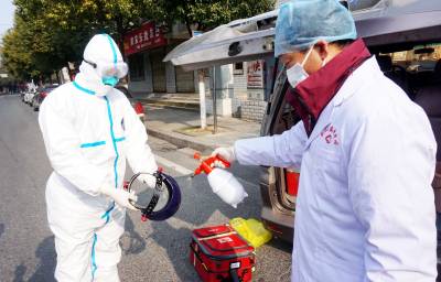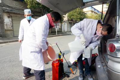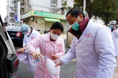 在喷洒消毒期间其它防疫人员在现场与社区网格员和城关医院医护人员见面交接事项,为凝似患者家庭成员检测体温,发放预防宣传资料,交待注意事项,等到屋内关门封闭消毒时间到了之后才可以开门回家。