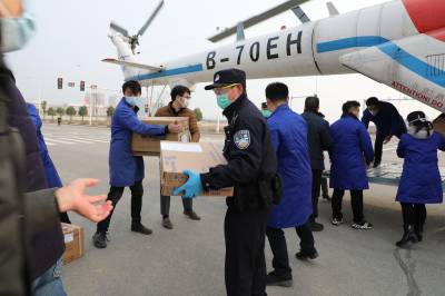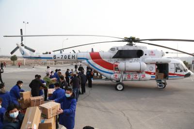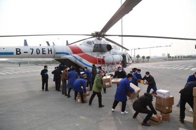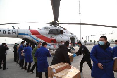 2月3日,一架载着医用物资的直升机停在国药控股襄阳有限公司门前公路上,在民警协助下第一时间转运到各大医院。从2月1日起,在气象条件允许的情况下,每天有一架直升机调配医药紧缺物资飞往襄阳。为确保直升飞机高效转运物资,樊城公安每天对周边道路实施了临时交通管制,并协助工作人员快速搬运物资,确保运输过程顺利进行。
