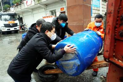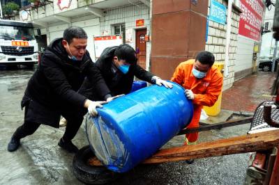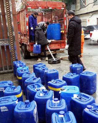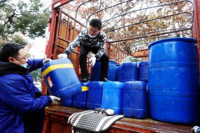 2020年2月6日是正月十三,十堰市郧阳区水利和湖泊局茂源供水公司正在冒着雨雪天气将消毒液装运上车。为支援乡镇村消杀防疫工作,郧阳区调配6000斤消毒液配备给茂源供水公司负责20个乡镇(场)重点场所喷洒消毒,以阻断新型冠状病毒的扩散。