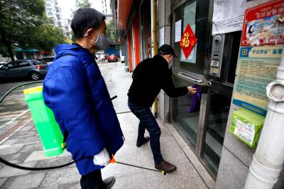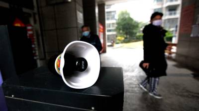 名流锦都小区门口,一支扩音器反复重播关于抗击疫情知识。物业管理人员正在为楼道闸门进行消杀。他们说:“每天进行两次消杀。”