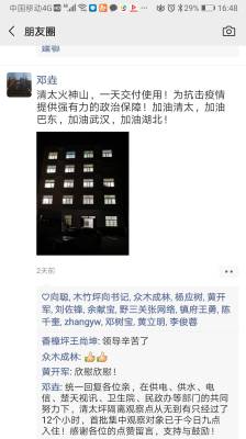 “从领命到送电,不到4小时,神速!”共产党员服务队员雷厉风行,快捷快速服务得到清太坪镇指挥部高度肯定。指挥部、镇人大主席邓垚在朋友圈里写到:“清太“火神山”,一天交付使用,为抗击疫情提供可靠政治保障!加油清太!加油巴东!加油武汉!加油湖北!