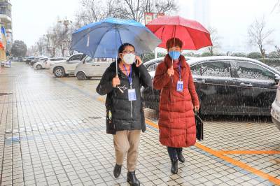 2月15日上午,竹山县大雪纷飞。为打好新冠肺炎疫情防控战,保护人民健康安全,城关镇西关社区党支部书记陈艳秋,例行率社区干部前往各劝导点,随时解决、解答居民生活用品保障等诉求。西关社区住有4163人,有散居户民200多户,独居户民6户。共设置22个关卡劝导点,每个关卡都有机关干部轮岗值守。陈艳秋说,守一个关卡,就象守一个山头,严防死守,生怕有一点儿闪失。西关社区有10名干部,其中女干部8人,她们从春节至今,全员已坚守了20多天,宣传、设卡、摸底、排查、为居民提供生活保障等,虽然她们很累,但都恪尽职守。