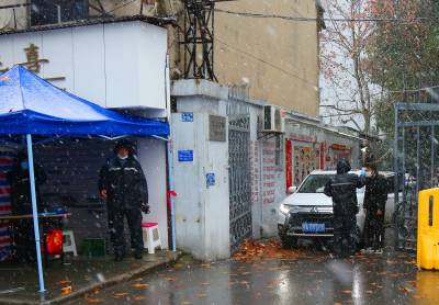 2019年2月15日,武汉大雪。在这天24时之前,武汉要达到将冠状病毒肺炎确诊者、疑似者和密接者全部送往医院和隔离区的目标,从而降低感染率。图为江汉区园林局下到北湖街德望社区人员在银丰公寓门口为外出者测体温 张垠摄