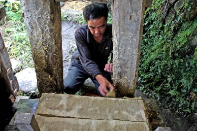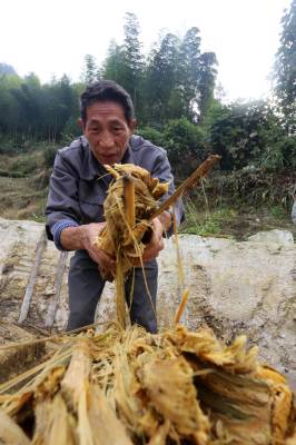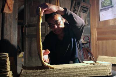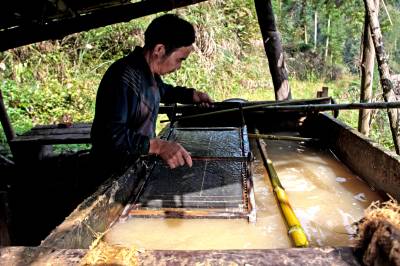 彭茂亮今年60岁,他己在这大山沟里当了38年的舀纸匠.他记得,从爷爷彭碧善那一辈起,他家就开始舀纸了,他父亲彭胜业继承了他爷爷的手艺,终身以舀纸为业,直到75岁时,死也没有离开舀纸坊,到彭茂亮这辈,已经是祖传第三代了,手艺越来越精,纸质越来越好,所以他舀出来的纸总是被当地和外地的纸贩争着抢购,家里的存货很少.