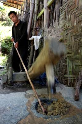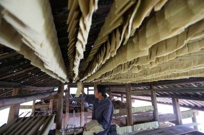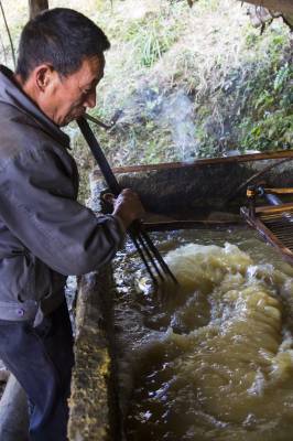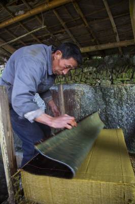 彭茂亮告诉说造这种纸总共有七十八道工序,然后他就开始一道一道的数;购石灰—修池—放竹条—彻筒—破竹—理条—理麻—打捆—搬运—下池—放灰—加水—洗麻—放麻—做桥子—筑笼—发汉—排污—加草(己成半成品纸浆)—抓麻—桃麻—舂麻—放踩槽—下大槽—下料—搅拌—粗打响槽棍—放水—加水—采阳桃藤—锤膏—打捆—放膏—制膏水—筑腰眼—钉磴桩—定位—打槽—放膏—打底壳—舀纸—清理边子—盖纸壳—加码—轻度踩压—加码—中度踩压—加码—重度踩压—揭盖板—分叠—烘烤—刨叠—揭纸—扫纸—凉纸—收纸—备绳—备压纸竹块—捆纸—上市!中间还有很多道工序,记录时归纳成了六十一道.