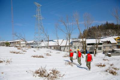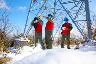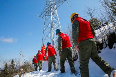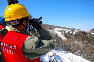 2月16日,国网巴东县供电公司党员突击队员正在对 35千伏茶绿线进行巡线作业。受冷空气南下影响,巴东县高海拔地区遭遇罕见雷电大风、雨雪冰雹袭击,高海拔乡镇山间、道路积雪,部分乡镇冰雹持续大30分钟,雷电大风、雨雪冰雹给电网安全运行带来较大影响。35千伏茶绿线跨越绿葱破高海拔地区,是茶店子变电站连接35千伏绿葱坡变电站重要输电线路,共有铁塔53基。为保证主网线路安全,国网巴东县供电公司运维部迅速组织力量对该线路进行特别巡视,雪地巡线非常辛苦,队员们要对每一个塔基、线路、瓷瓶、拉线等设备进行巡视检查,发现问题及时处理。(视界网 焦国斌 王祖满 摄)