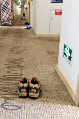 放眼看去,刘俊等人的房间门口均摆着一双鞋子,门口一侧均挂着一个垃圾袋,里面装有帽子、手套、口罩等医疗废弃物。房门张贴着纸条,有的写着“工作人员勿进,自己消毒”,或“请喷我”等字样。“请喷我”是提醒酒店人员可以对房门把手消杀。
