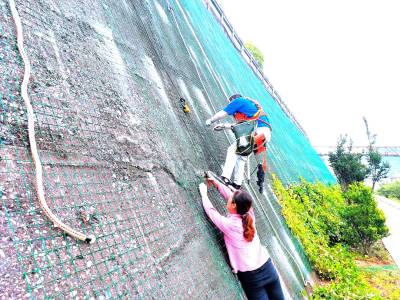 7月1日,竹山县园林部门组织技术人员在县城南关高岸河堤上安装立体绿化攀爬网。